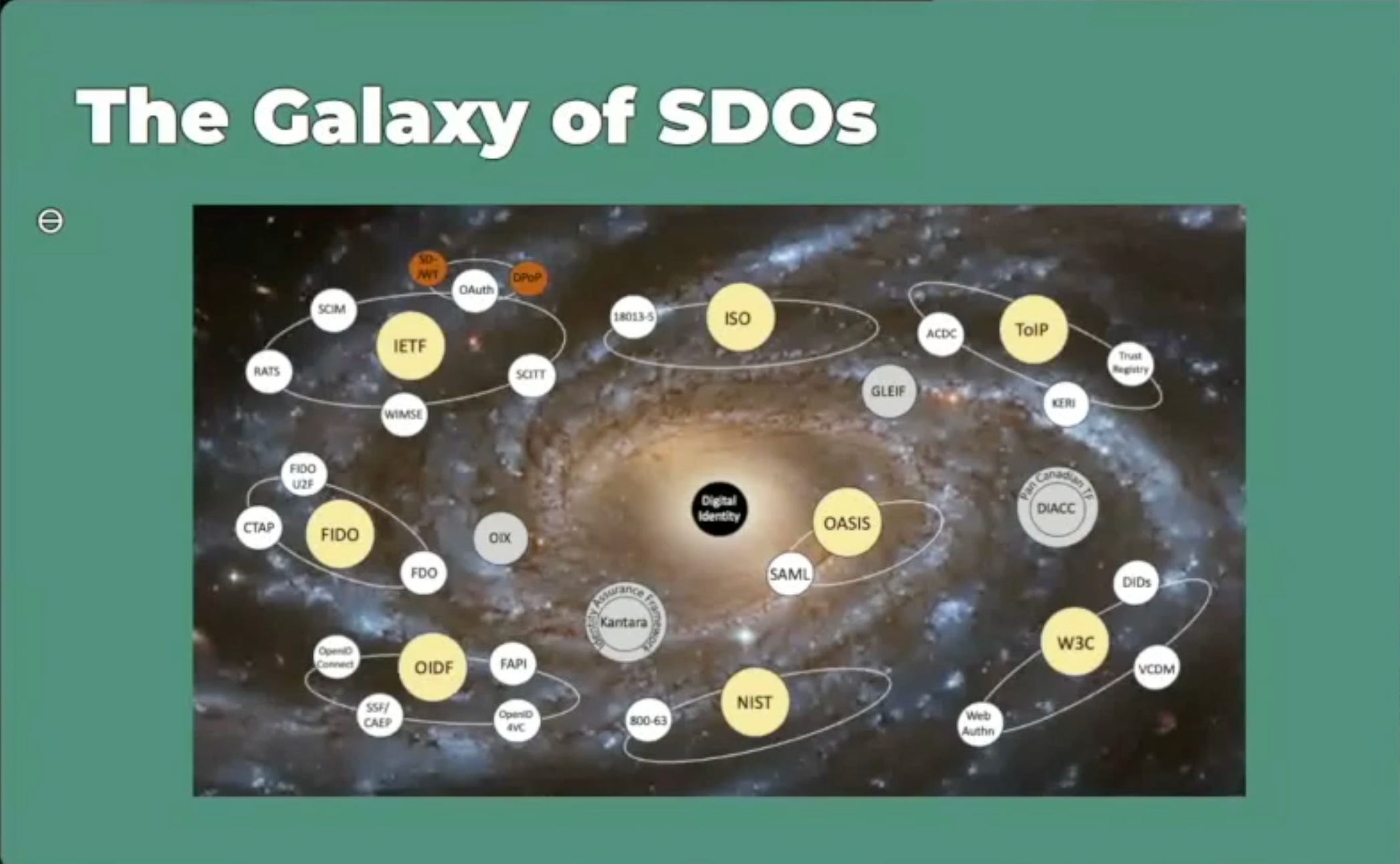 Insbesondere in diesem Kontext sind Standards relevant: Was wird anerkannt? Was darf gefordert werden? Heather Flanagan, Co-chair der W3C Federated Identity Working Group, zeigte mit der Darstellung der “Galaxie der SDOs” (Standard Development Organizations) auf, dass digitale Identitäten kompliziert sind. Neben ISO, W3C beschäftigen sich eine Vielzahl von Organisationen - und Unternehmen - damit, aller mit einer anderen Perspektive und Zielsetzung. Deswegen mag es scheinen, als würden einige dieser Standards miteinander im Wettbewerb stehen, aber vielleicht benötigt es das.